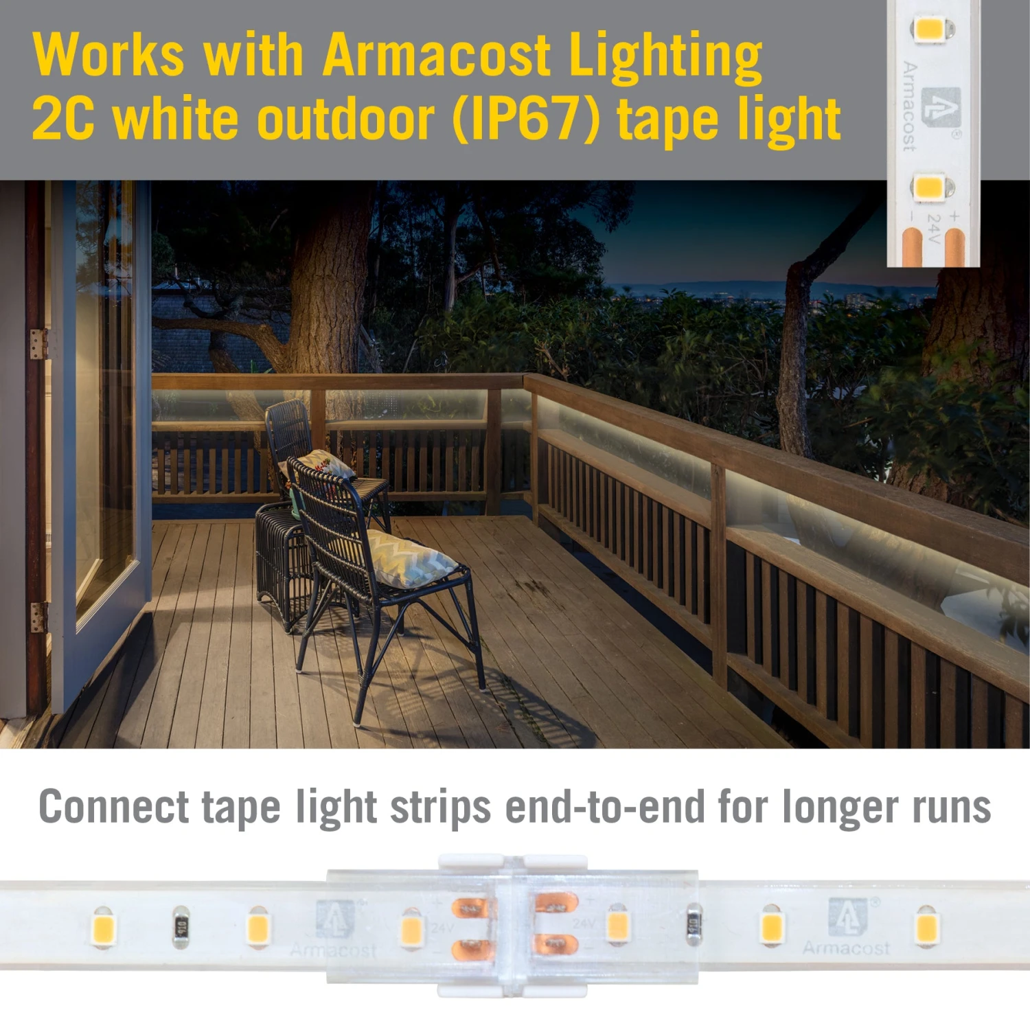 Armacost Lighting’s 2-Pin IP67 Outdoor Strip to Strip Splice Connectors are used to connect 2 sections of white IP67 tape light into 1 continuous strip. Create tight, secure connections for 2C white, 8mm-wide IP67 tape light. Use with 14mm Heat Shrink Tubes (Item 970020, sold separately) and a heat gun to make a water-tight connection. Great for large or custom outdoor LED lighting installations for homes, businesses, boats, and RVs.