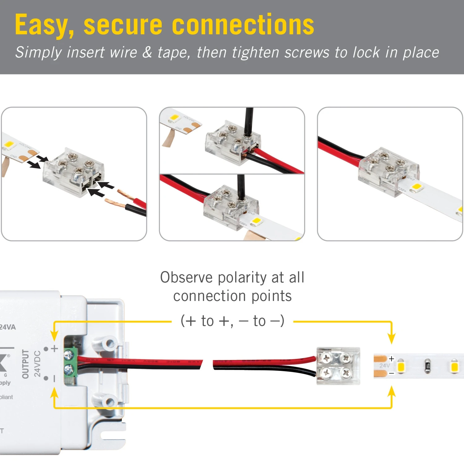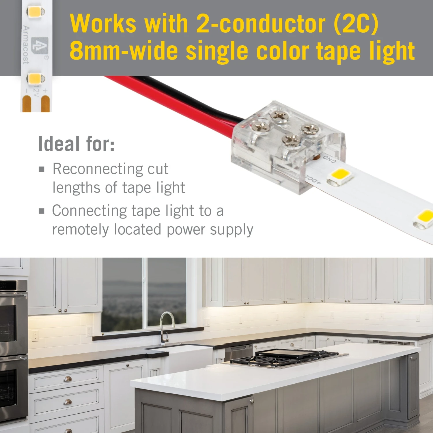 Create extra tight connections for 2C white or single color LED strip light with Armacost Lighting’s 2-Pin tape to wire LED screw connectors. Simply insert wire and tape into the connector, then tighten screws to lock into place. Use this unique strip light connector to reconnect cut lengths of tape light or to connect your installation to a remotely located driver.