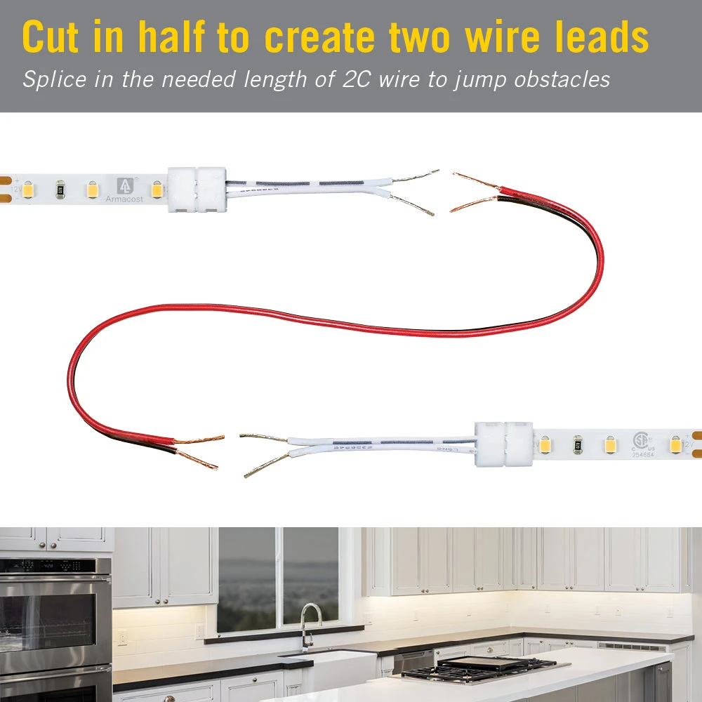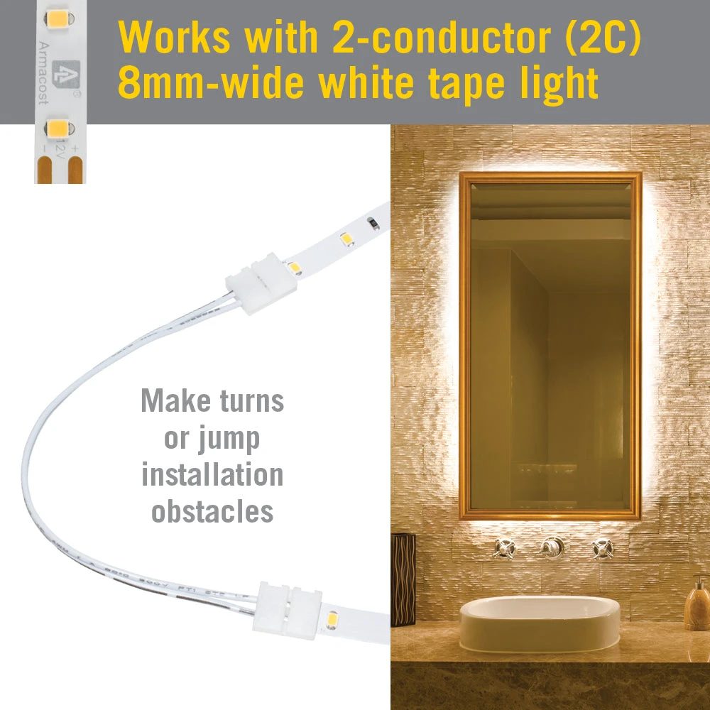 2-Pin Snap Strip to Strip Connectors from Armacost Lighting are used to connect 2 sections of white or single color tape light into 1 continuous strip. Easy to use, no soldering, tight, secure connections for 2C tape light. Great for custom undercabinet and accent LED lighting installations in residences and businesses.
