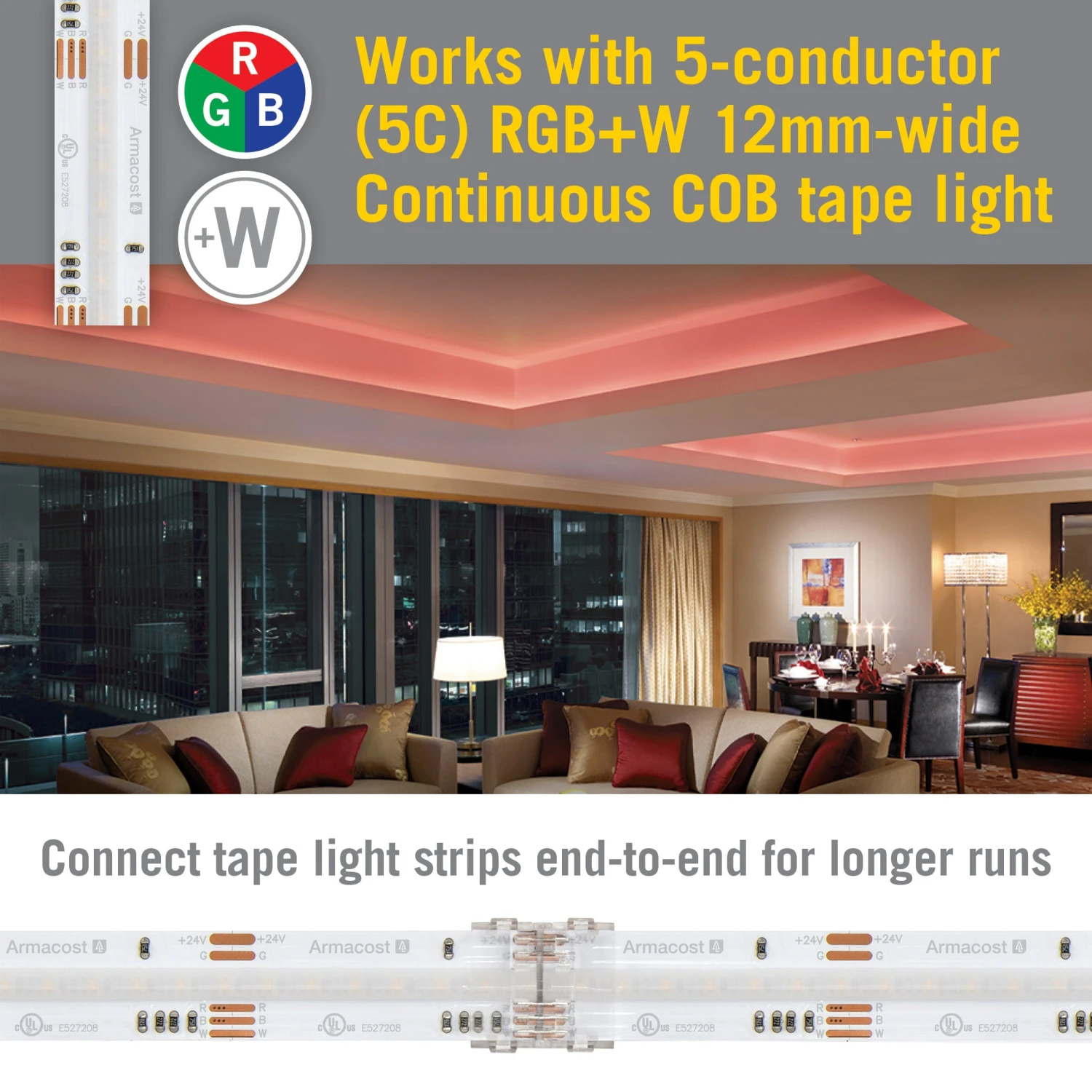 The Armacost Lighting RGB+W LED Tape Light Splice Connectors enable effortless joining of two multicolor RGB+W COB LED tape light strips to form a continuous LED lighting run. This Chip-on-Board (COB) LED strip light ensures  seamless strip lighting with no spots or breaks, making it perfect for under cabinet lighting.