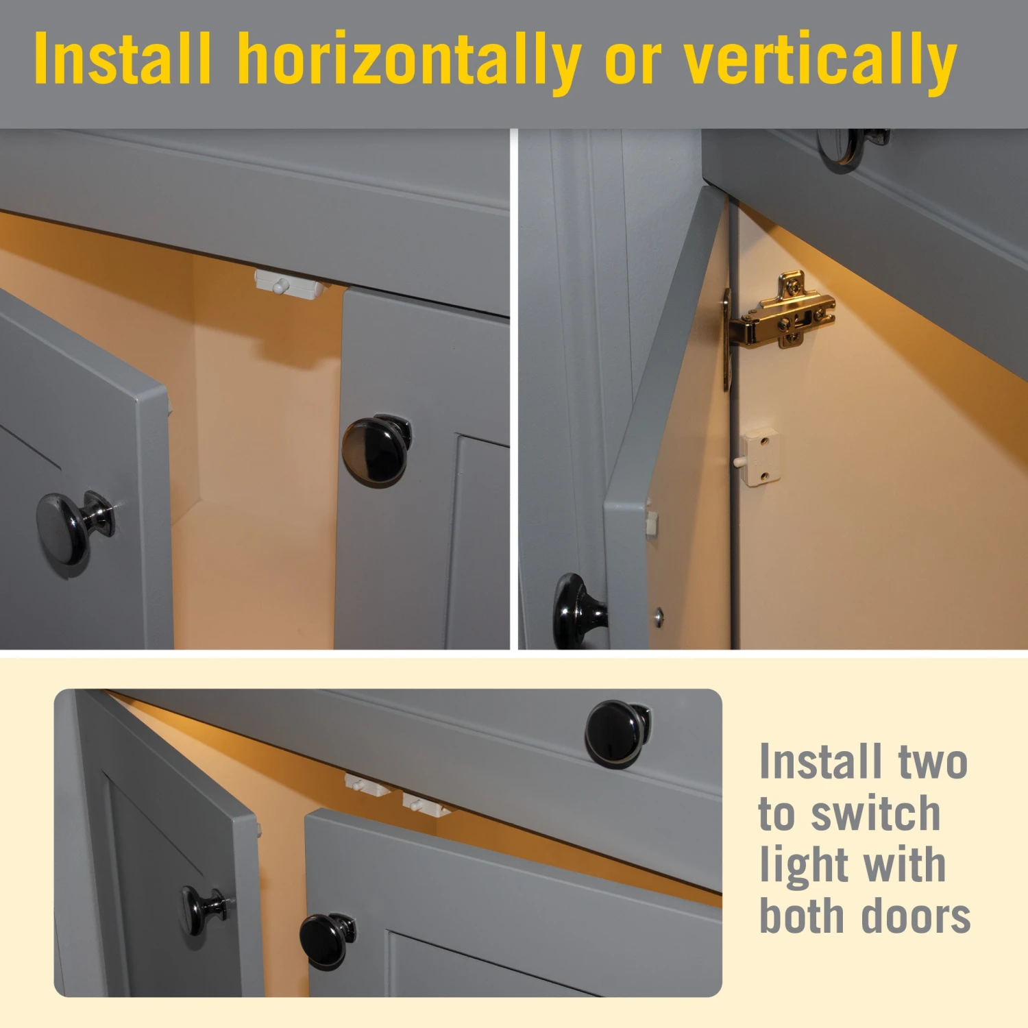 The push summary cabinet door light switch from Armacost Lighting is designed to work with LED lights installed in cabinets, closets, pantries, wine cabinets, or any space with a door or drawer. The pressure switch turns LED lights on automatically when a door or drawer is opened. When the door or drawer is closed, the LED light will turn off. Install in a single run connecting one light to one LED power supply for small spaces, or in an array setup with multiple LED lights for larger areas. Note maximum amp output for array installations.