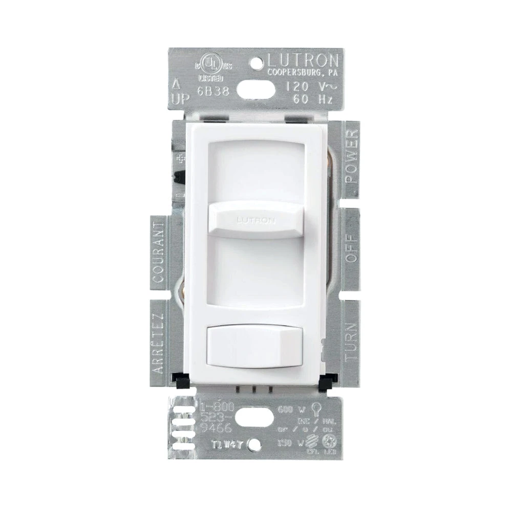 Dim your white LED lighting with the stylish and energy-saving Lutron Contour Dimmer. Features a smooth slide, captive knob to adjust brightness to your preference. The rocker switch turns your lights on and off without adjusting the dimming setting. The smooth dimmer adjusts between 0-100%. Ideal for dimmable LED undercabinet, accent, linear, puck, and task lighting installations from Armacost Lighting. 1.6D x 4.1H x 2.1W