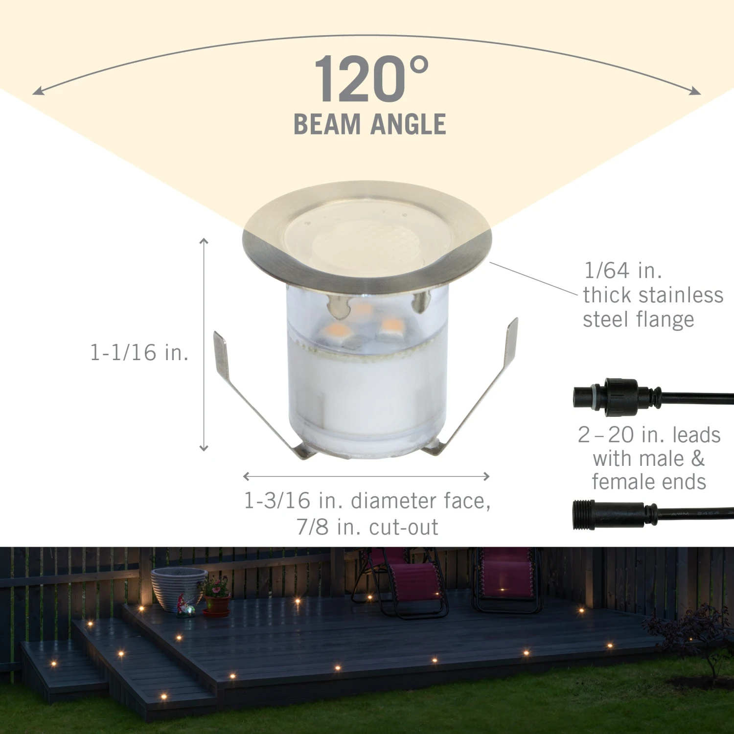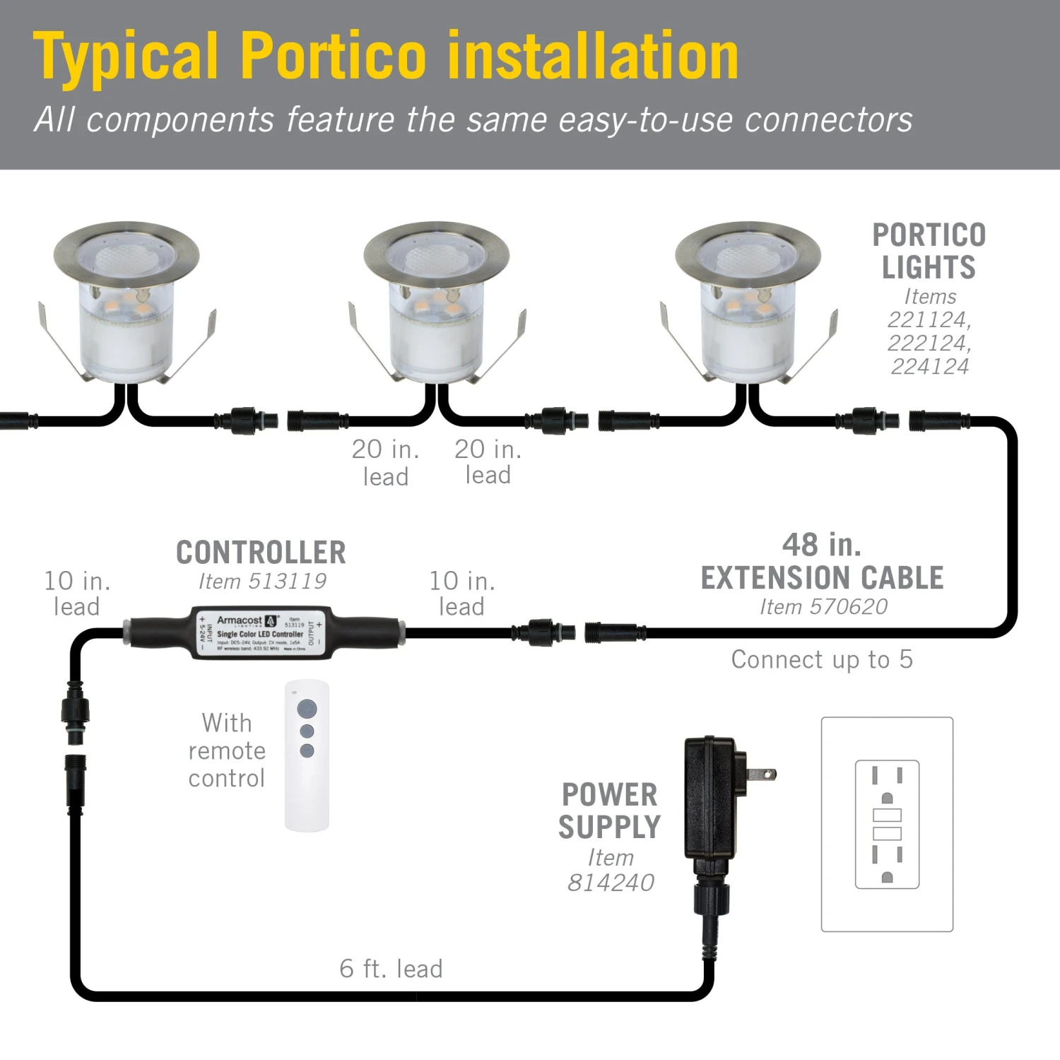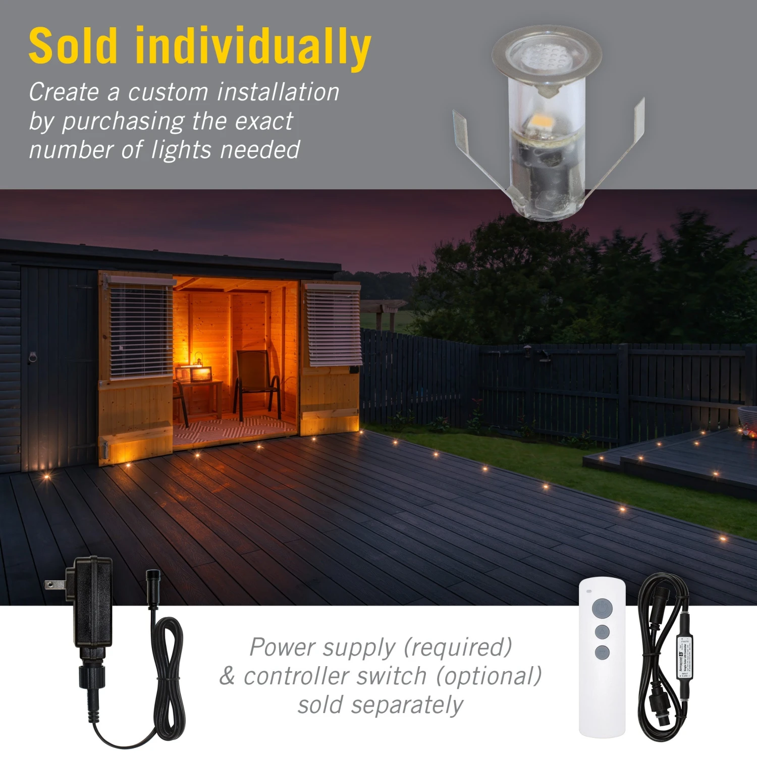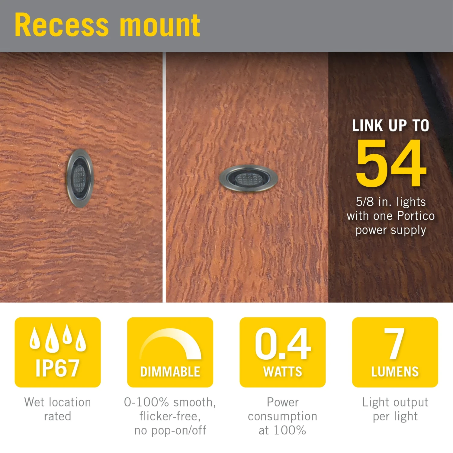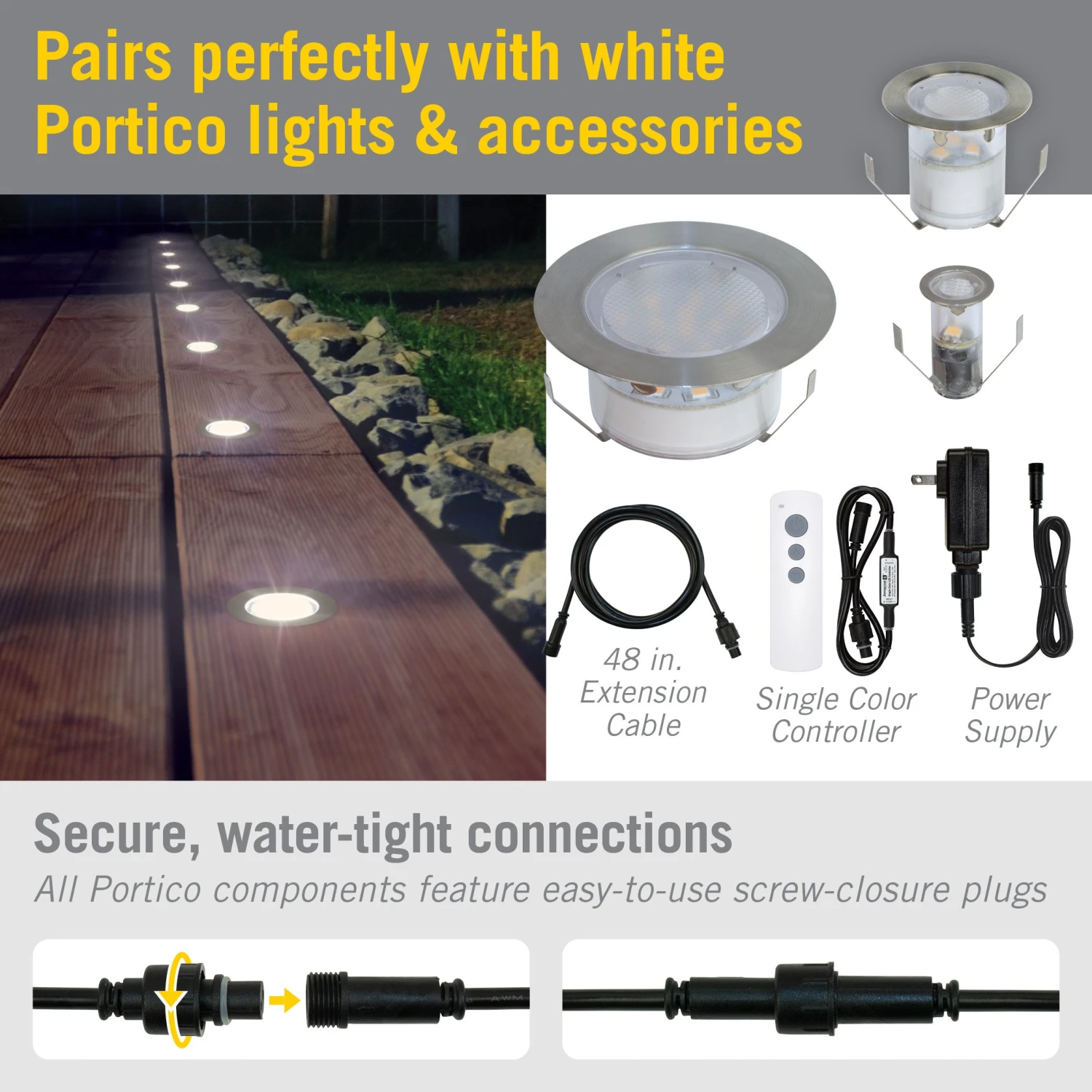 Armacost Lighting’s Portico White Recessed Outdoor Mini LED Lights are components in the exclusive Portico Outdoor Recessed Lighting System that also includes a proprietary LED light controller, LED Power Supply, and extension cables for large installations. The stainless steel waterproof LED lights feature one-piece construction and are flush, recess mountable in any outdoor space including decks, docks, walkways, and steps. All Portico system components feature easy to use screw-closure plugs for secure, water-tight connections. The Portico small LED lights are perfect for hardwire puck light and recessed LED light installations in outdoor spaces.
