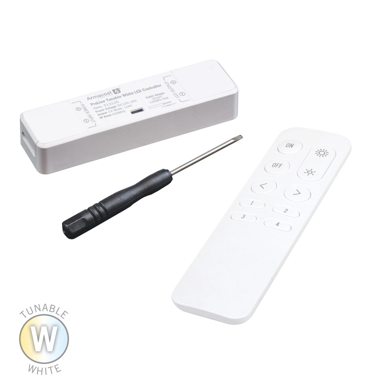 The Armacost Lighting Proline LED Controller for CCT Tunable White LED Lighting features a new, sleek and ergonomic design with soft-touch, positive click summarys. Made specifically for use with RibbonFlex Pro Tunable White LED Strip Lights and Tunable Under Cabinet LED Puck Lights, the LED controller adjusts white color temperatures between 2700K warm white and 5000K daylight white, and dims LED lights from 100% to 0% brightness. The Radio Frequency (RF) remote control works through cabinets, doors, and walls from up to 50ft away and allows you to save up to four favorite color temperature and brightness level settings. The 2C terminal block receiver and CCT remote controller can be paired with multiple tunable white lighting installations.