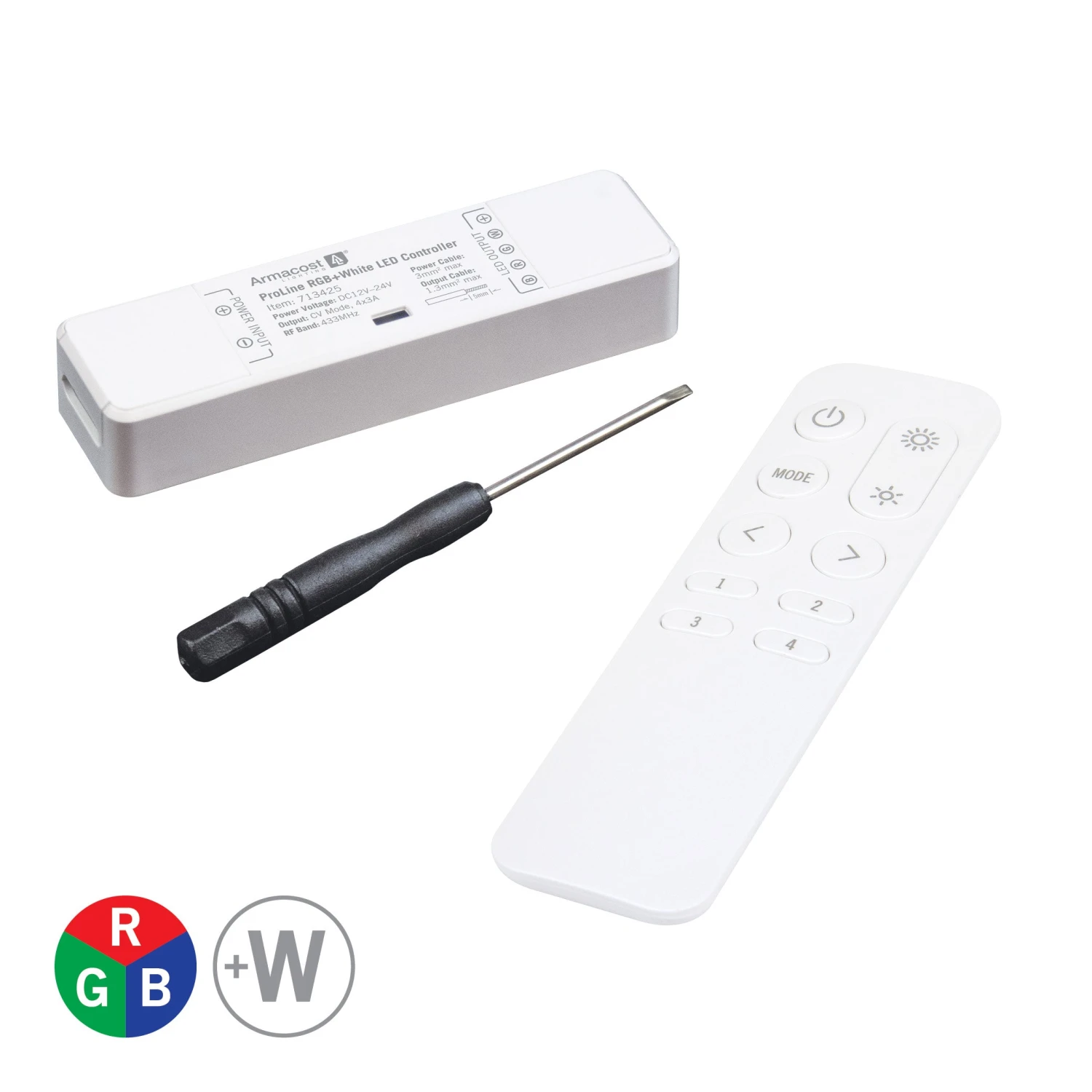 The Armacost Lighting ProLine RGB+White Color LED Lighting Control is the perfect solution for professional undercabinet LED lighting control option. Designed with high-grade components that pair seamlessly with Armacost Lighting Multi-Color LED tape Light. The terminal block connectors are easy to use and make the wiring easy to conceal. The controller works through cabinets, doors, and walls from up to 50ft away using Radio Frequency (RF) technology. The LED remote-controller comes preprogrammed with a full spectrum of 25 dynamic colors, 40 color changing effects, and 0 to 100% dimming control. Great for LED lighting installations of all size and works with both 12-volt and 24-volt LED lighting installations. The LED controller is the perfect solution for both commercial and residential LED strip light installations.