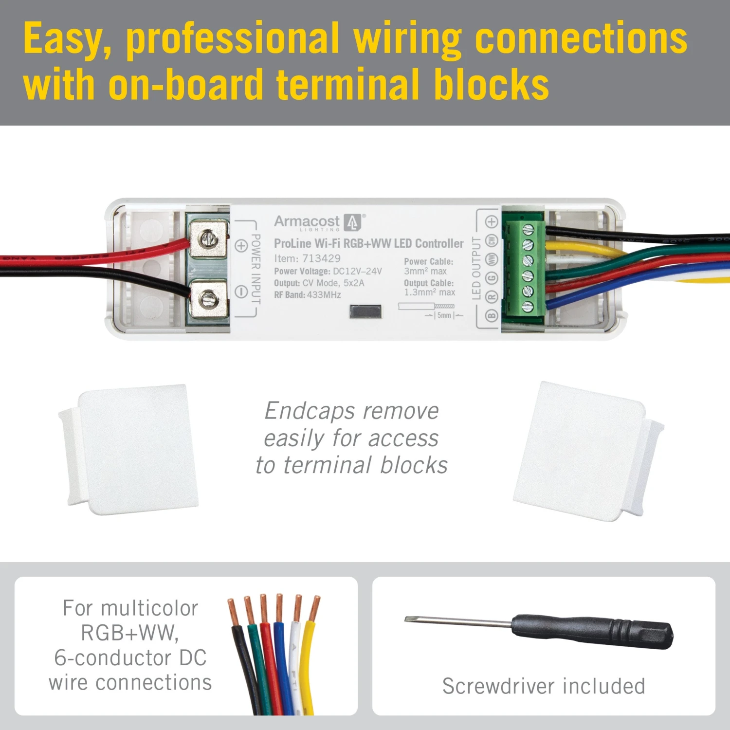 The ProLine Multicolor RGB+WW LED Amplifier from Armacost Lighting acts as a repeater for RGB+WW color changing LED strip lights. Perfect for long LED lighting installations, the LED amplifier is compact in size and easy to conceal. The LED repeater does not generate power, so it must be paired with an additional power supply to repeat remote signals. When paired with the ProLine Multicolor RGB+WW Wi-Fi LED Controller, your installations can be controlled wirelessly using the Tuya smart app.