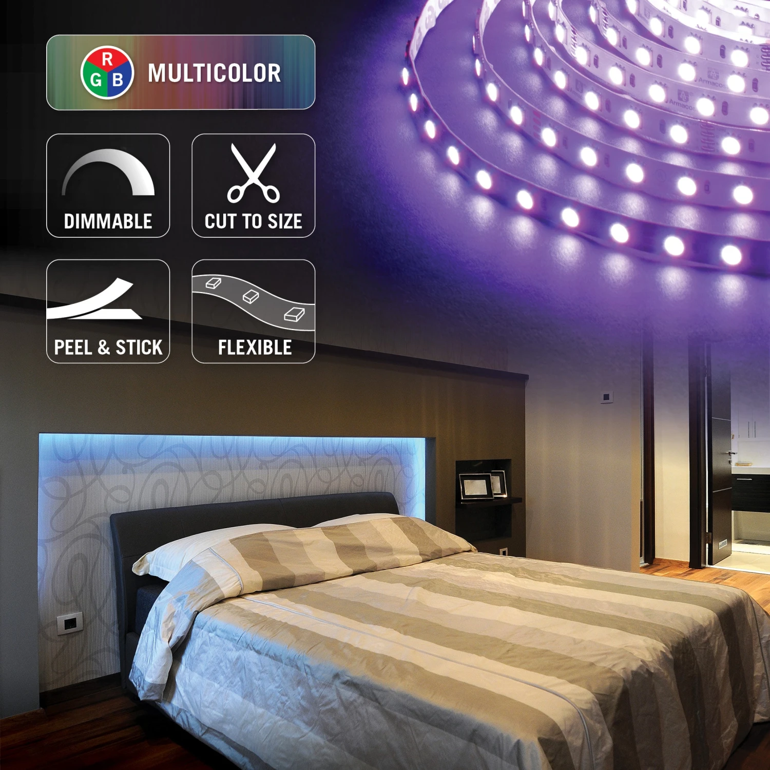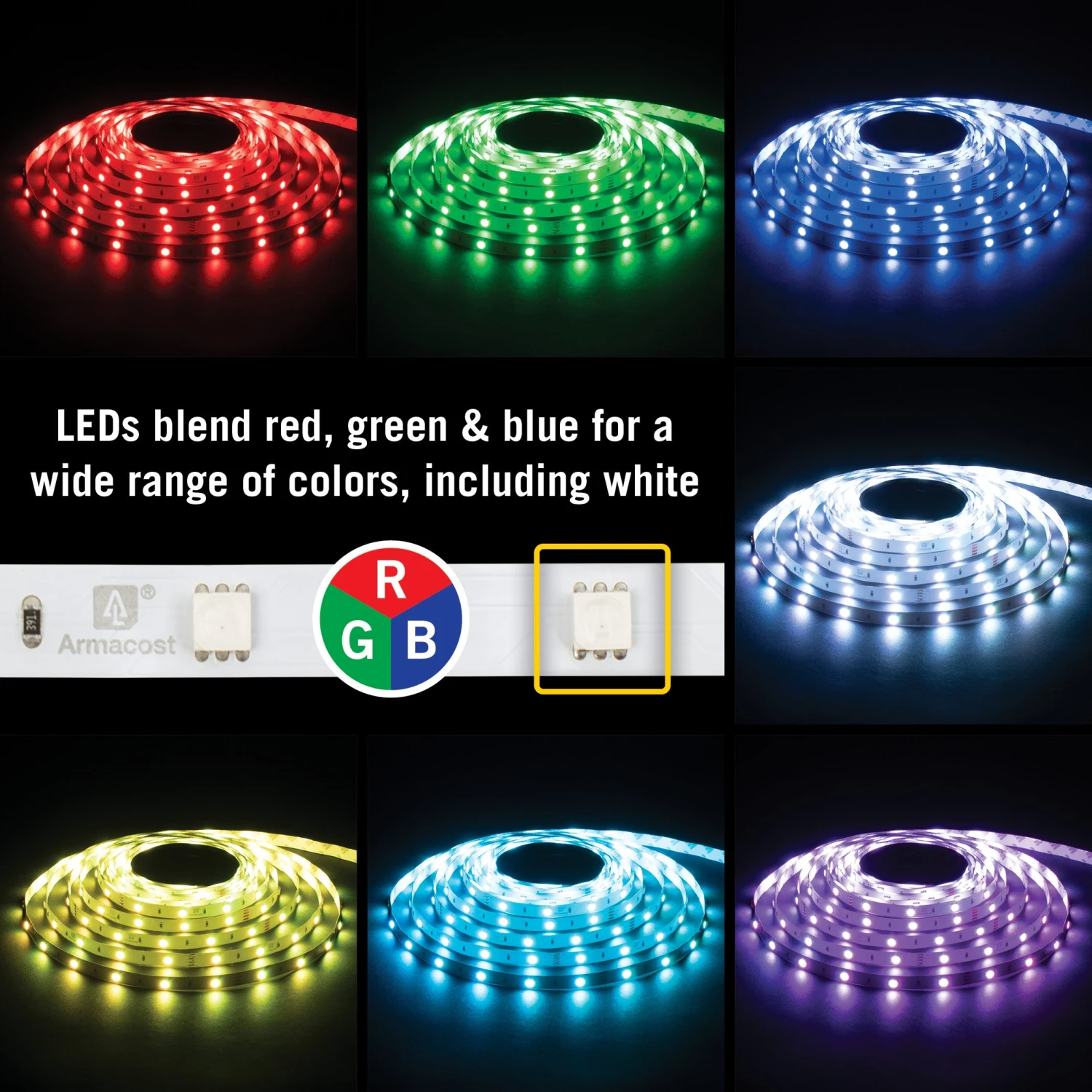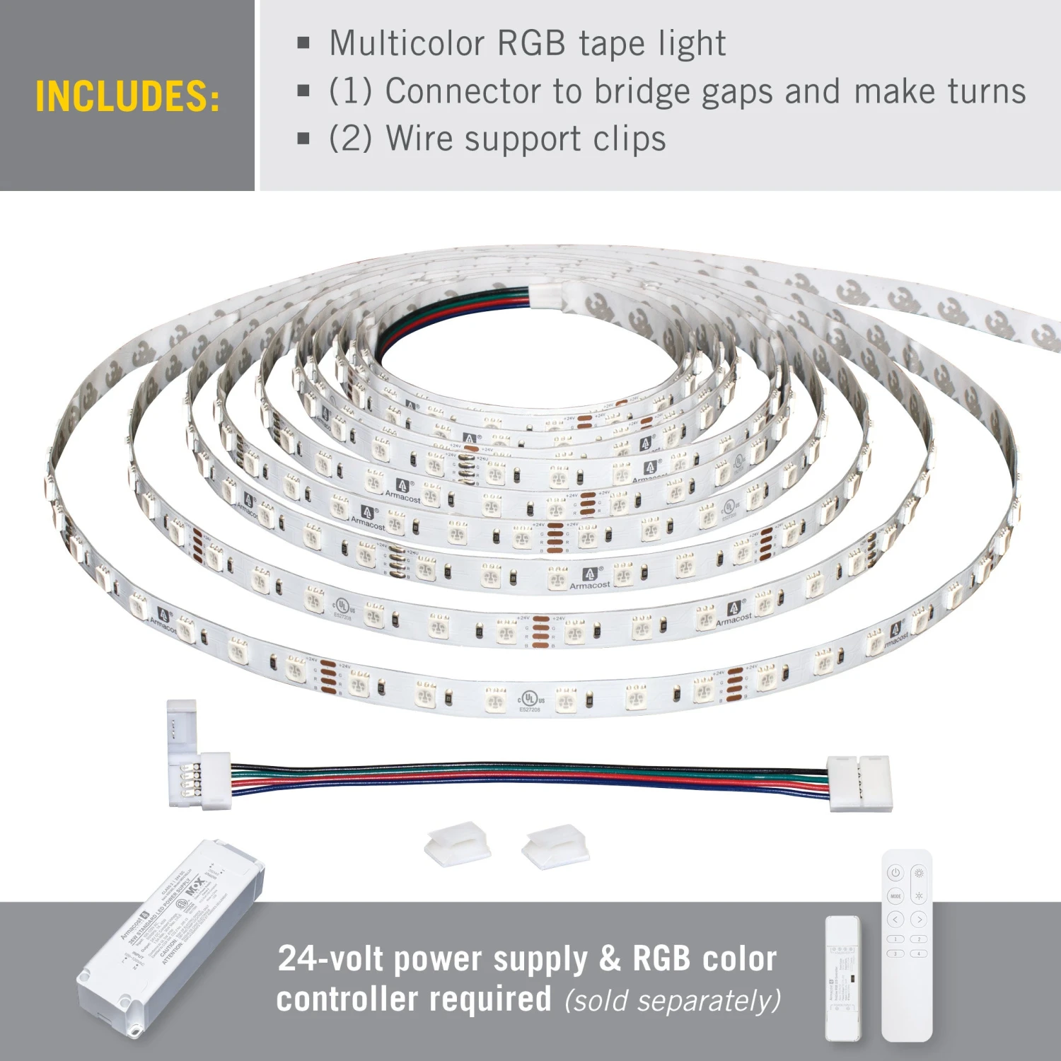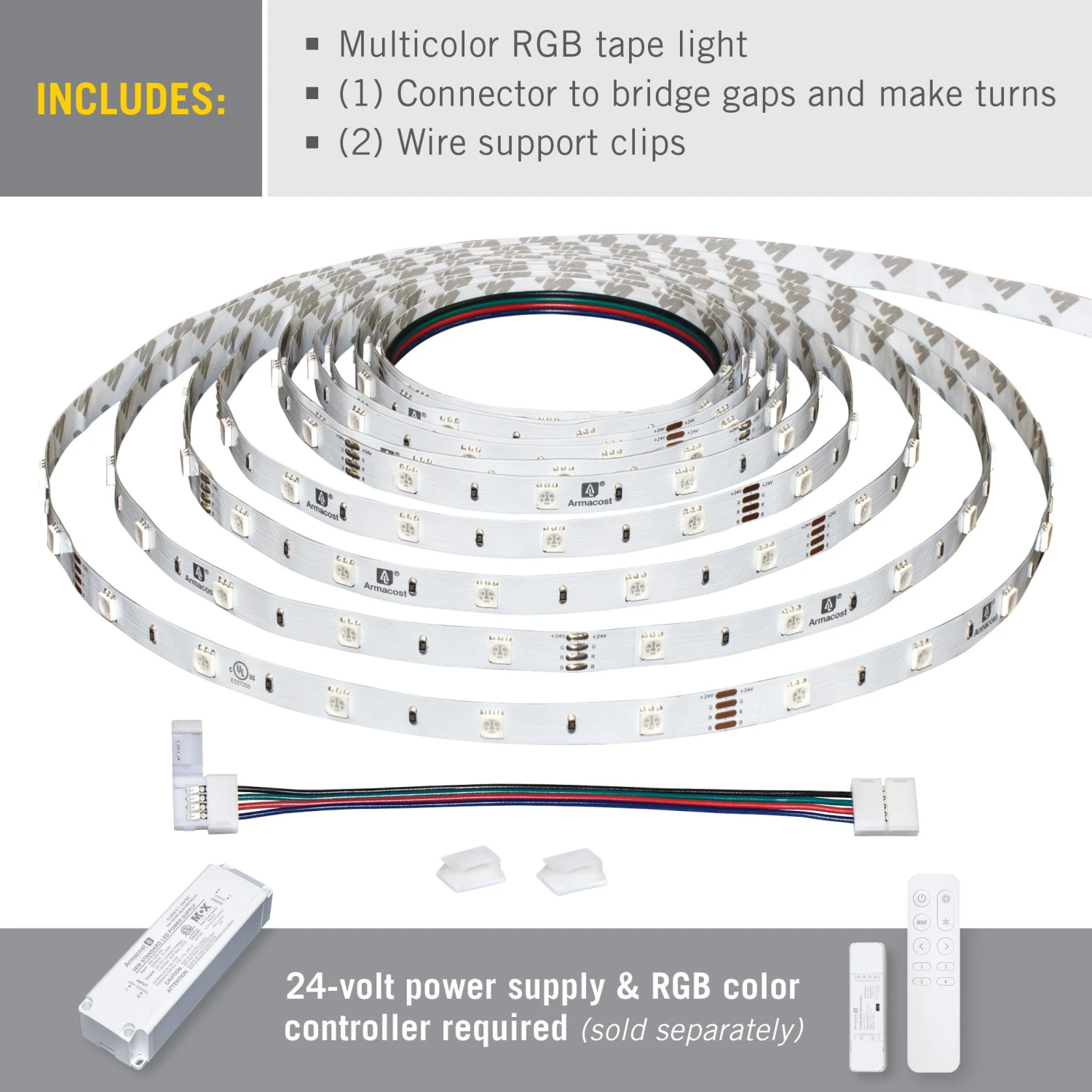 Armacost Lighting’s RibbonFlex Home Multicolor LED Strip Light Tape is a great solution for any low voltage, energy-efficient multicolor accent lighting project. Dimmable RGB LEDs blend red, green, and blue for a wide range of colors, including shades of white. Use the tape light with it’s full length or cut to size as needed. Cut tape light pieces can be securely reconnected using the included tape connectors. RibbonFlex LED Tape Light is part of Armacost Lighting’s top-quality component-based system, designed for custom installations. Use with an Armacost Lighting RGB Multicolor LED Controller for dimming and color control. 24V power supply required (sold separately).