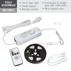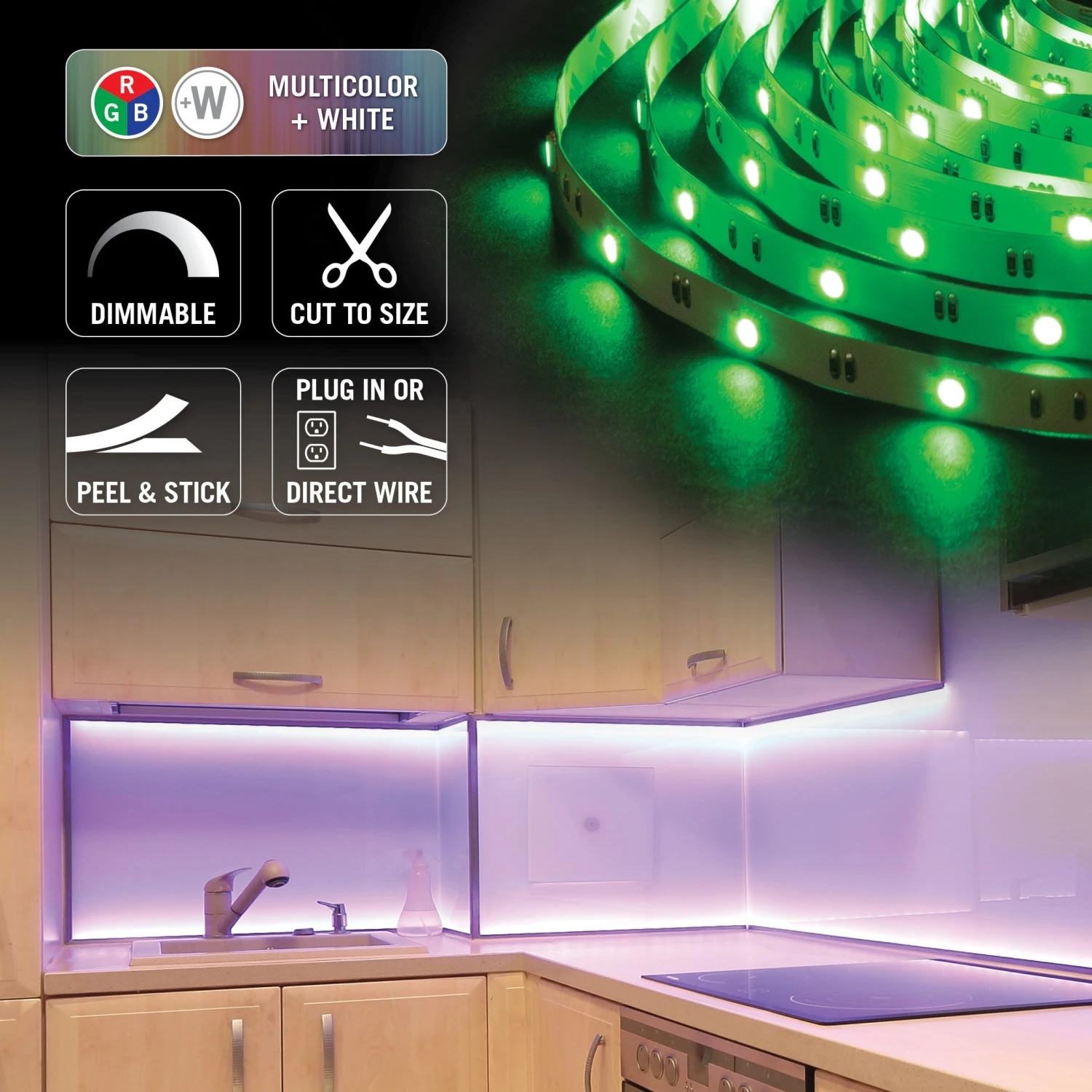The Hardwire RibbonFlex Home RGB+ W LED Strip Light Kit from Armacost Lighting features a direct wire LED power supply for easy, at-home installation. The multicolor plus white tape light kit is a perfect all-around solution for any accent lighting project, including entertainment areas, kitchens, bedrooms, or dorm rooms. Select from 25 preset color options, plus pure white. LED strip light kit comes with a RF (Radio Frequency) remote to control color, dimming, and LED lighting effects. Control up to three LED lighting kits with a single remote for larger custom installations.