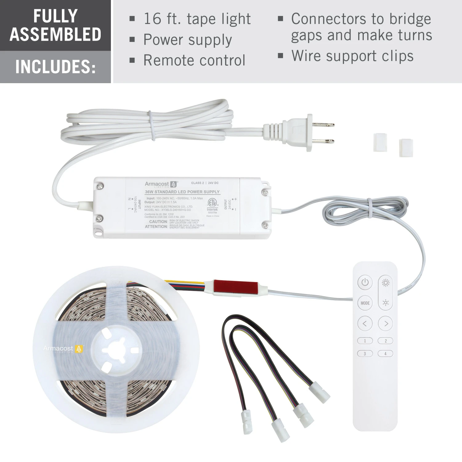 Enjoy dynamic color changing effects with the Armacost Lighting RibbonFlex Home 24V RGB+WW Multicolor Strip Light Kit. Â With highly versatile RGB+WW LED lights (also known as RGB+CCT), you have a wide range of RGB color combinations and multiple shades of white (warm 2700K – cool 5000K) at your finger tips. Â This all-in-one LED lighting kit includes a premium RF remote for effortless control of power, color choices, dynamic effects, dimming level, and four saved favorite settings. Â Our adhesive LED tape light is easy to cut and reconnect as needed using the included connectors. Â Ideal for enhancing kitchens, bedrooms, game rooms, or any indoor space.