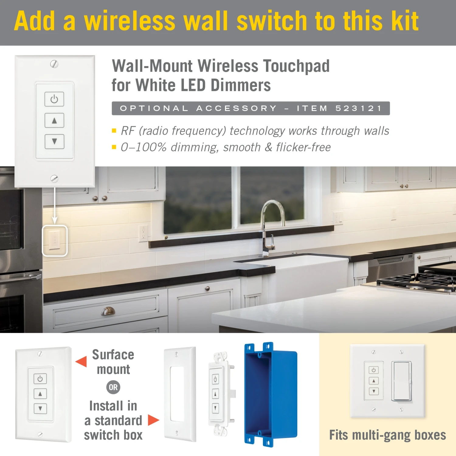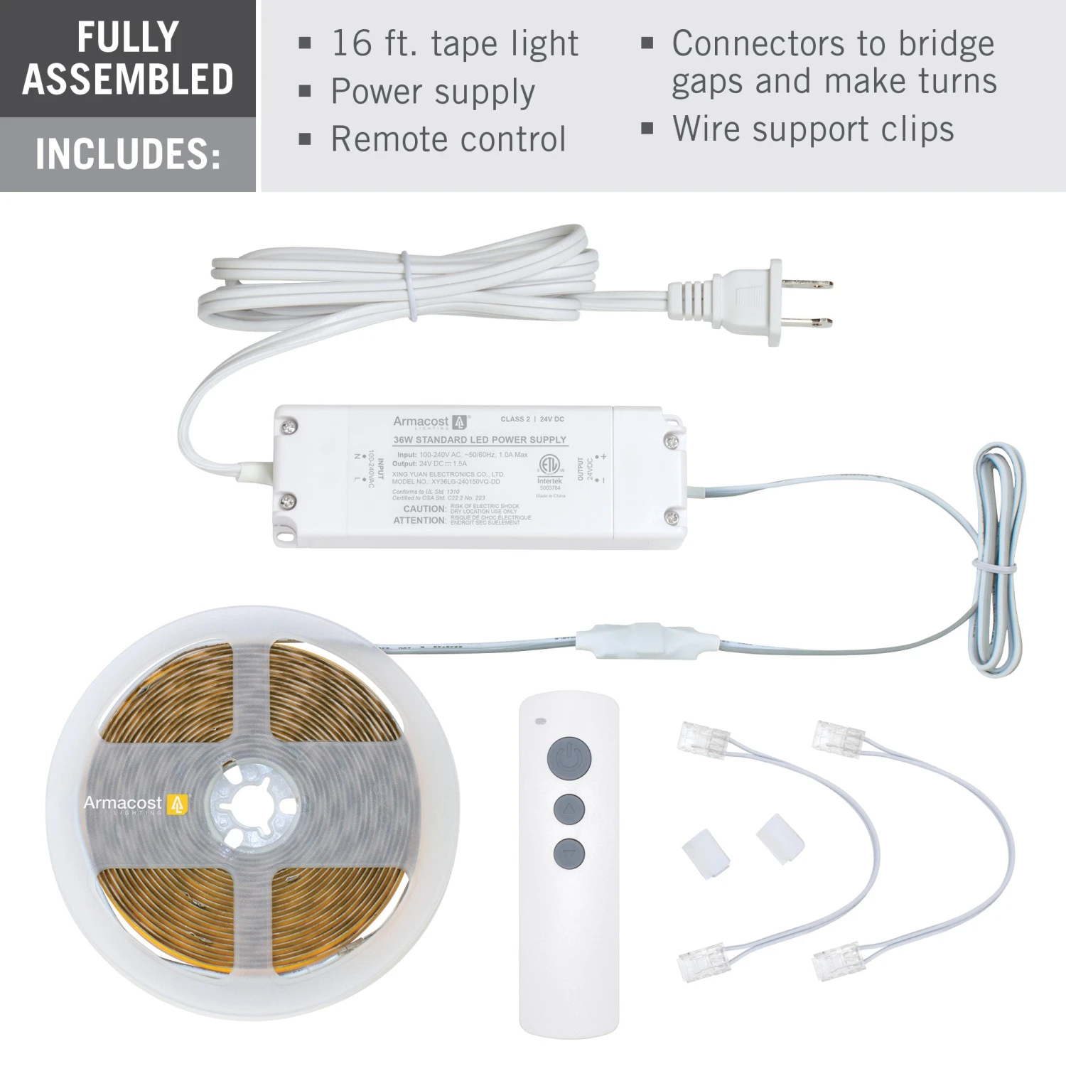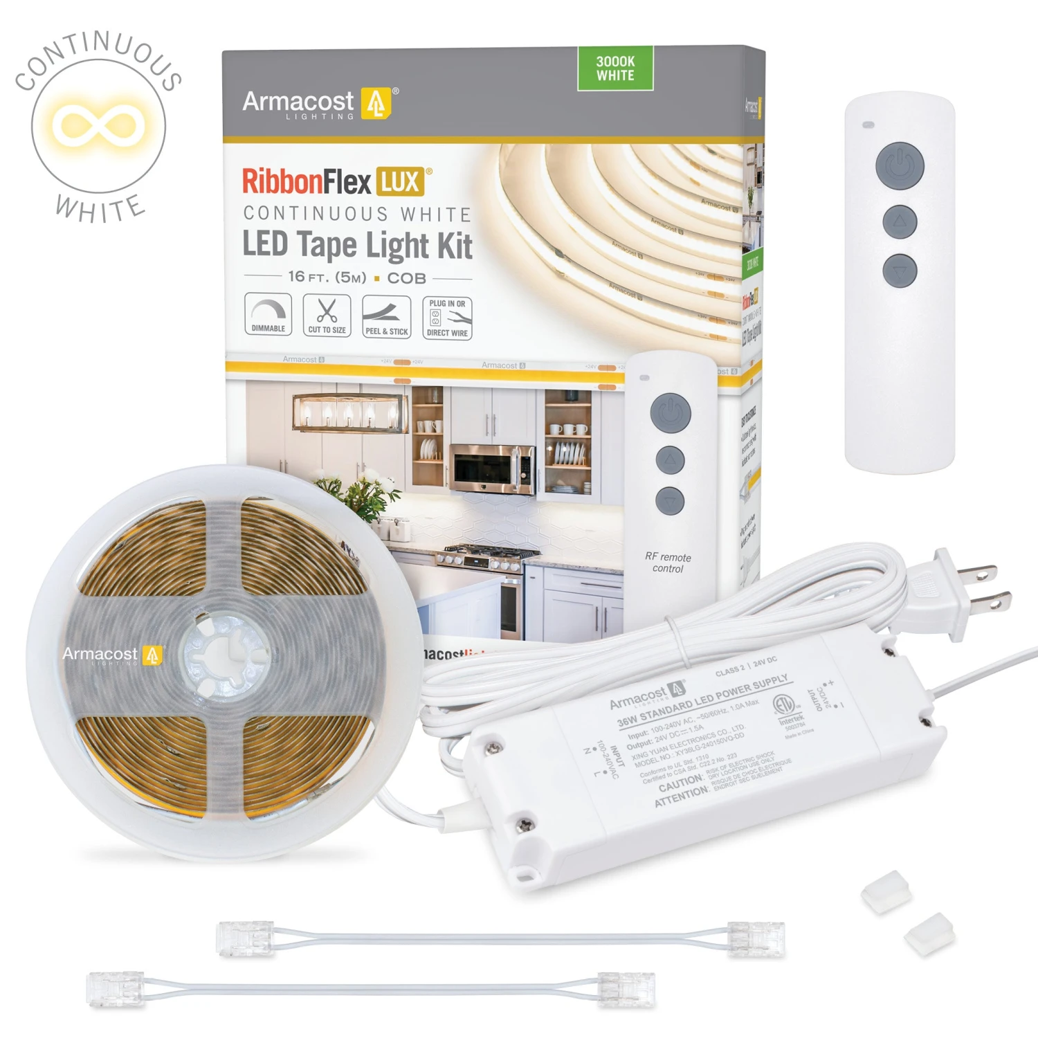 The Armacost Lighting Chip on board (COB) White LED Strip Light kit is an easy-to-install solution for seamless accent lighting. Using COB technology, the LED strip light kit reduces the reflection of visible LED dots (diodes) on countertops by creating a continuous strip of light. The COB LED kit is easy to install using the 3M peel-and-stick backing. The LED kit is easily controlled from up to 50 ft. away using the RF (Radio Frequency) remote control.