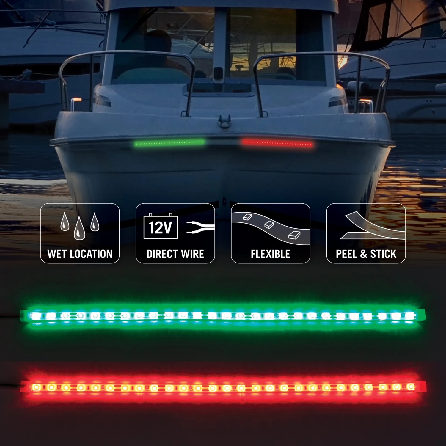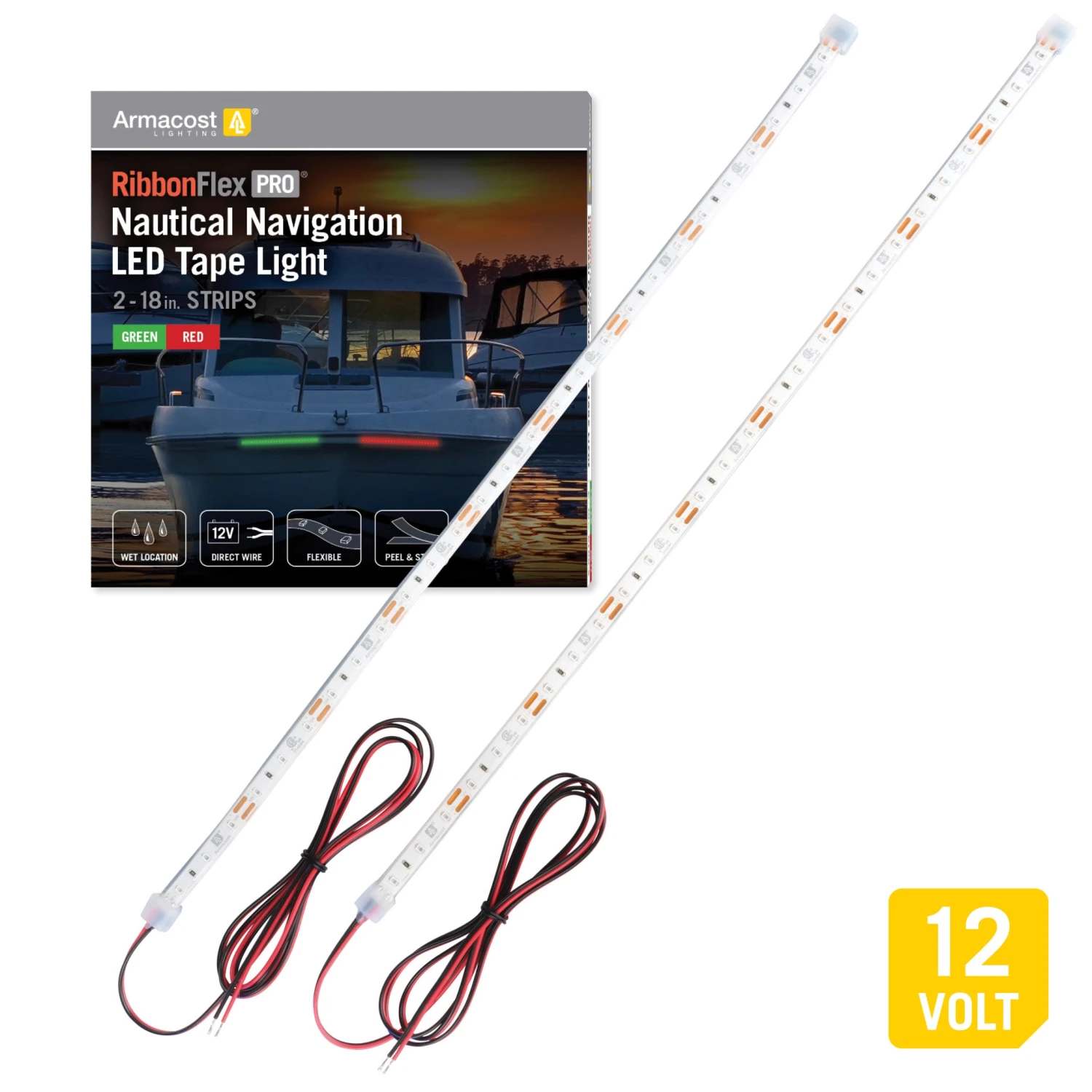 RibbonFlex Pro Nautical Navigation Red & Green LED Strip Light Tape from Armacost Lighting is rated IP67, making it an ideal weatherproof solution for watercraft navigation lighting on the bow of boats and yachts. The 18” LED strip lights are weatherproof, but not meant to be fully submersed underwater. IP67 rated tape light is 100% protected from dust and sand and protected against immersion in water between 5.9 – 39.37 inches (15cm – 1m) deep for up to 30 minutes. Can be installed in a variety of outdoor or wet locations, such as poolside decks, patios, porches, docks, RV & campers, and restaurants. Refer to US Coast Guard navigation light regulations specific to your vessel.
