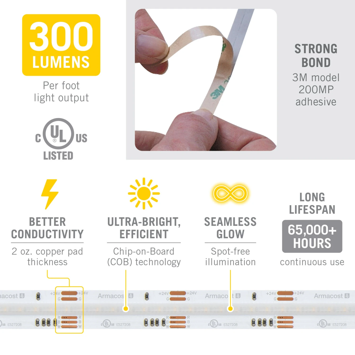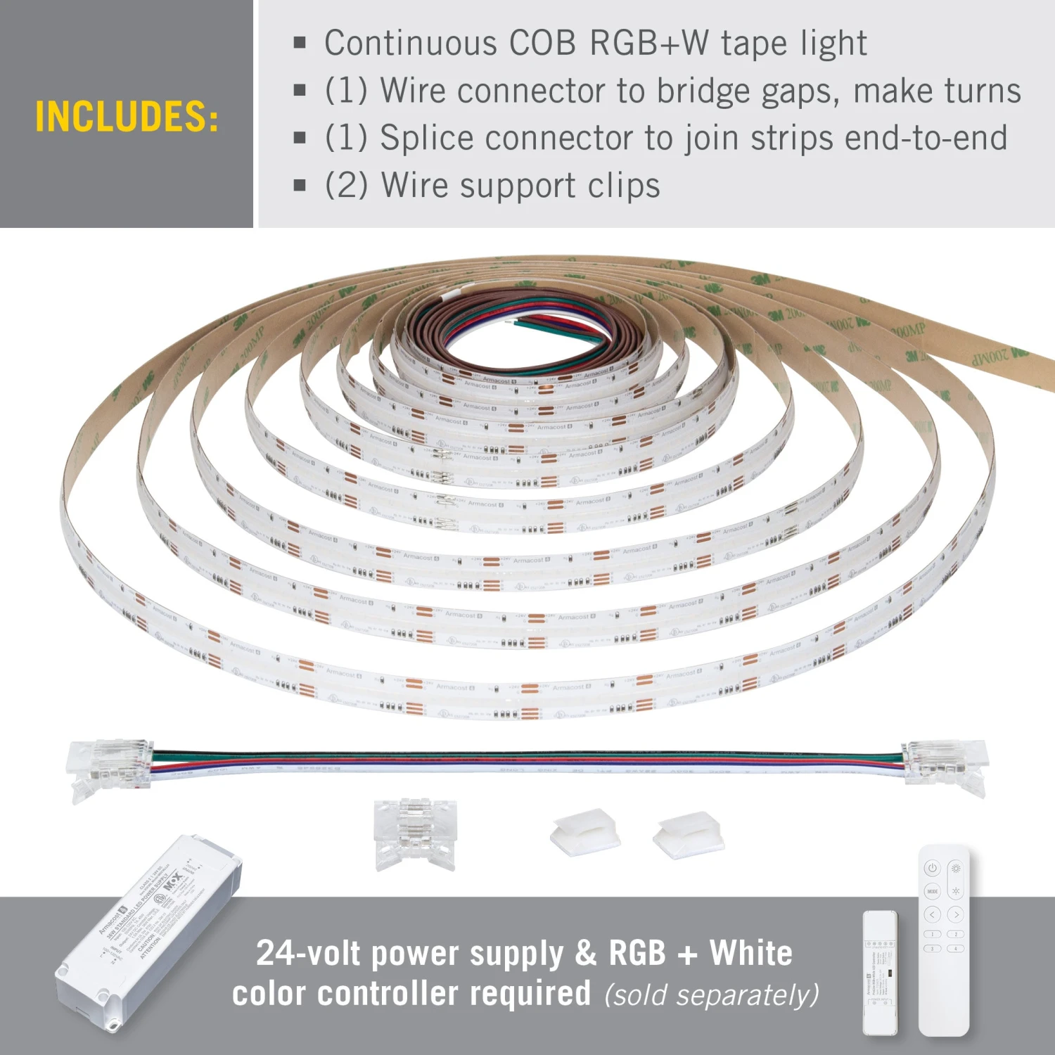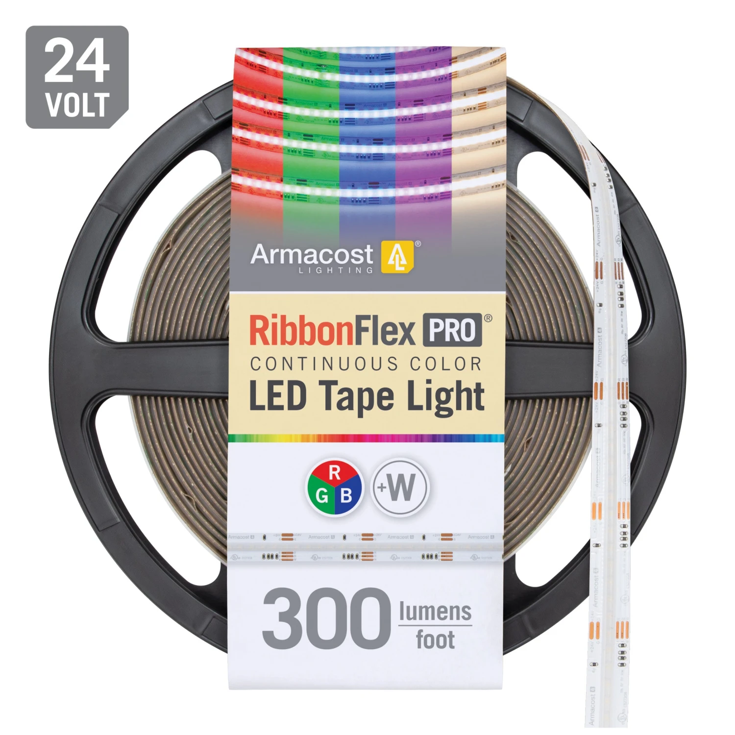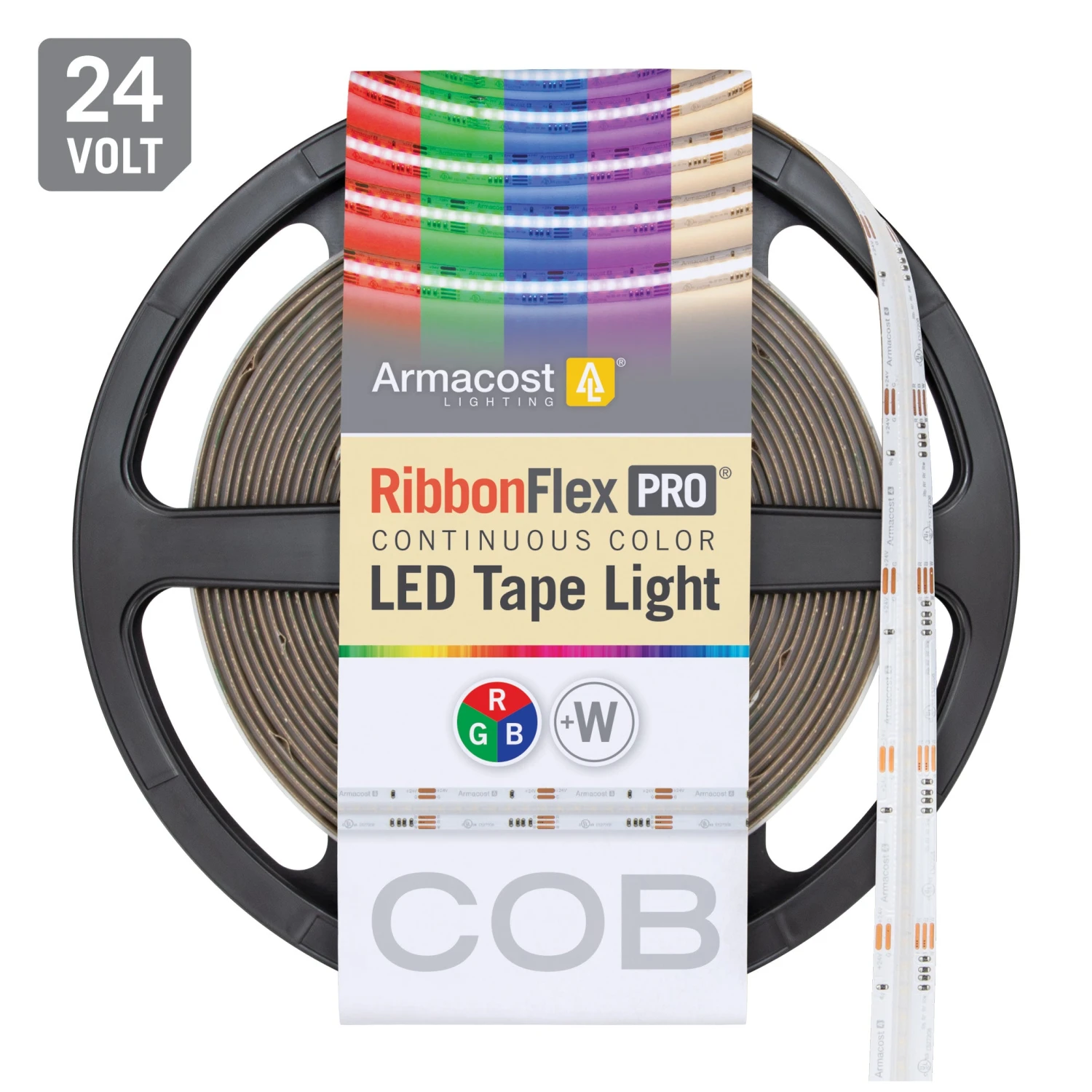 24 Volt RibbonFlex Pro Multicolor RGBW LED COB Tape Light from Armacost Lighting is a perfect choice for colorful accent lighting with a seamless glow. Excellent for reflective surfaces like counter tops and floors, dotless COB LED strip lights feature Chip-on-Board technology that create a continuous strip of light that is free of dots or spots. The Multicolor + White COB lights produce a variety of rich colors and a pure 3000K soft white. 24V LED Driver and a RGB+W Multicolor LED Controller for dimming and color control required and sold separately.