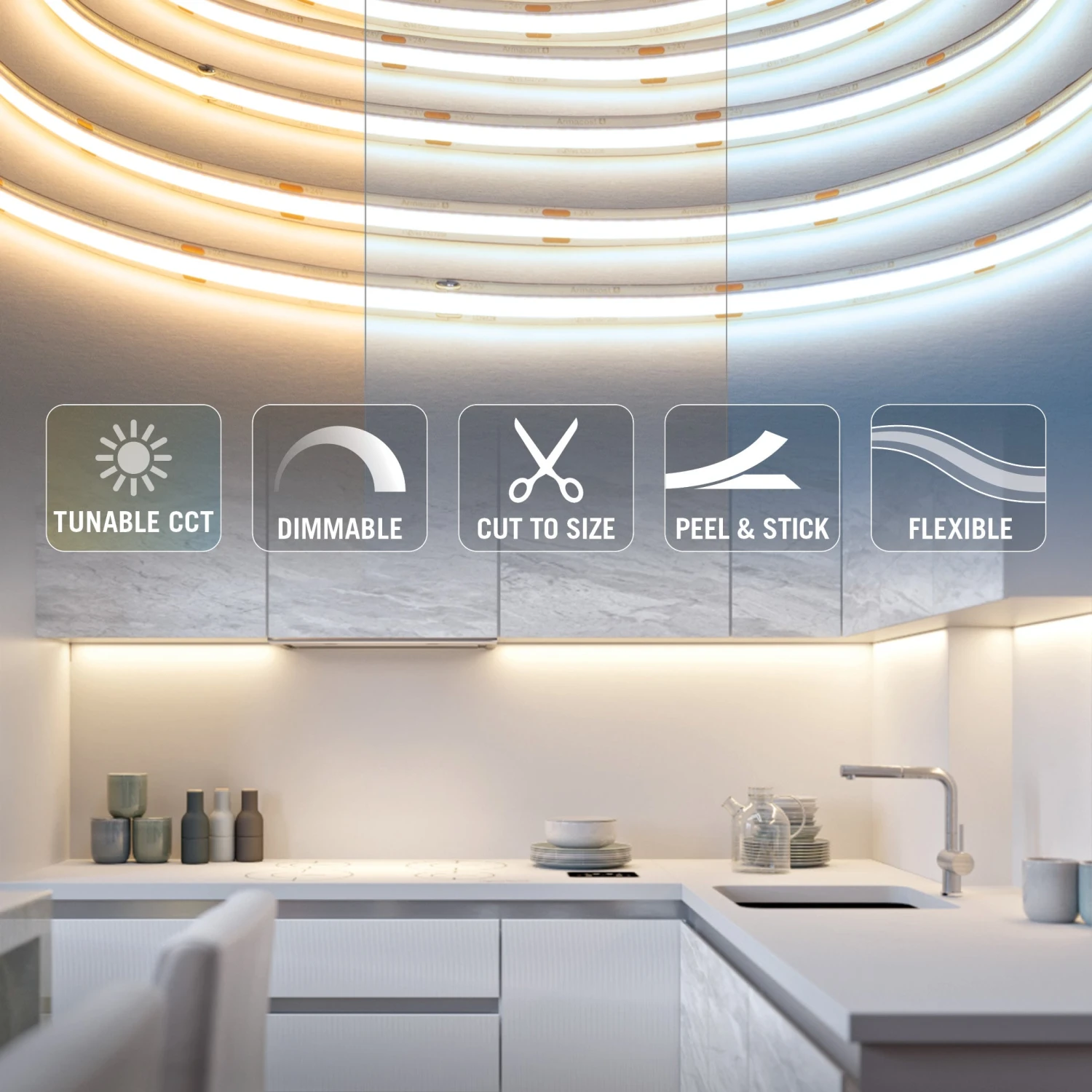 Armacost Lighting’s RibbonFlex Pro 24 Volt Tunable White Continuous LED Strip Light features both COB LED and CCT technology, making it the most adjustable and customizable accent lighting solution available. Dotless COB LED strip lights emit a continuous strip of illumination that is free of spots or breaks. CCT tunable technology provides shades of white light from a warm 2700K to a cool 5000K. With a seamless light output, this unique LED light tape is especially perfect for under cabinet lighting as it prevents visible LED dot reflections on countertops. Flexible LED strip light can be used as-is or cut to size for custom installations. 24V power supply and Armacost Lighting ProLine Tunable White LED Controller required and sold separately.