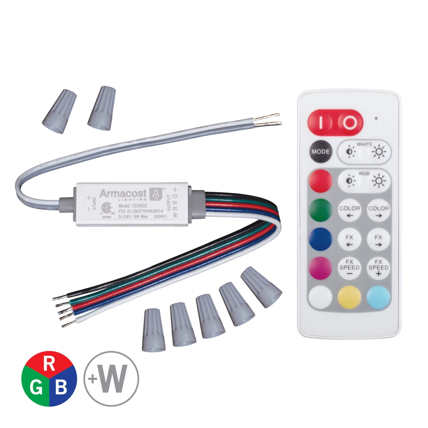 The Slimline RGB+W Multicolor LED Lighting Control is ultra-slim and compact, making it the perfect solution for controlling LED lights. The LED control is designed to function seamlessly with Armacost Lighting RGBW LED tape light installations. The LED lighting controller works through cabinets, doors and walls up to 50ft away, using Radio Frequency (RF) technology. The remote-controlled lighting control comes preprogrammed with a full spectrum of 25 dynamic colors, 40 color-changing effects and 0 to 100% dimming control. The LED remote-control is great for LED lighting installation of all sizes and works with both 12 volt and 24 volt LED lighting and power supplies. The RGB+W multicolor LED light control works seamlessly in both commercial and residential installations.