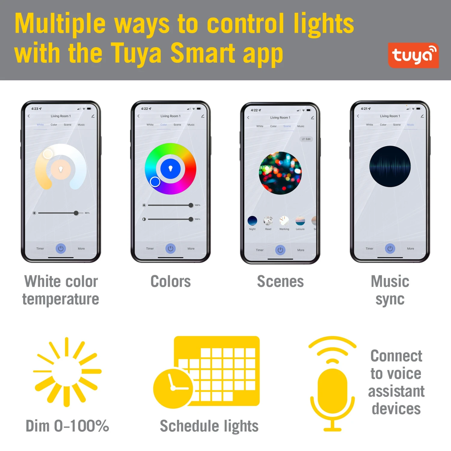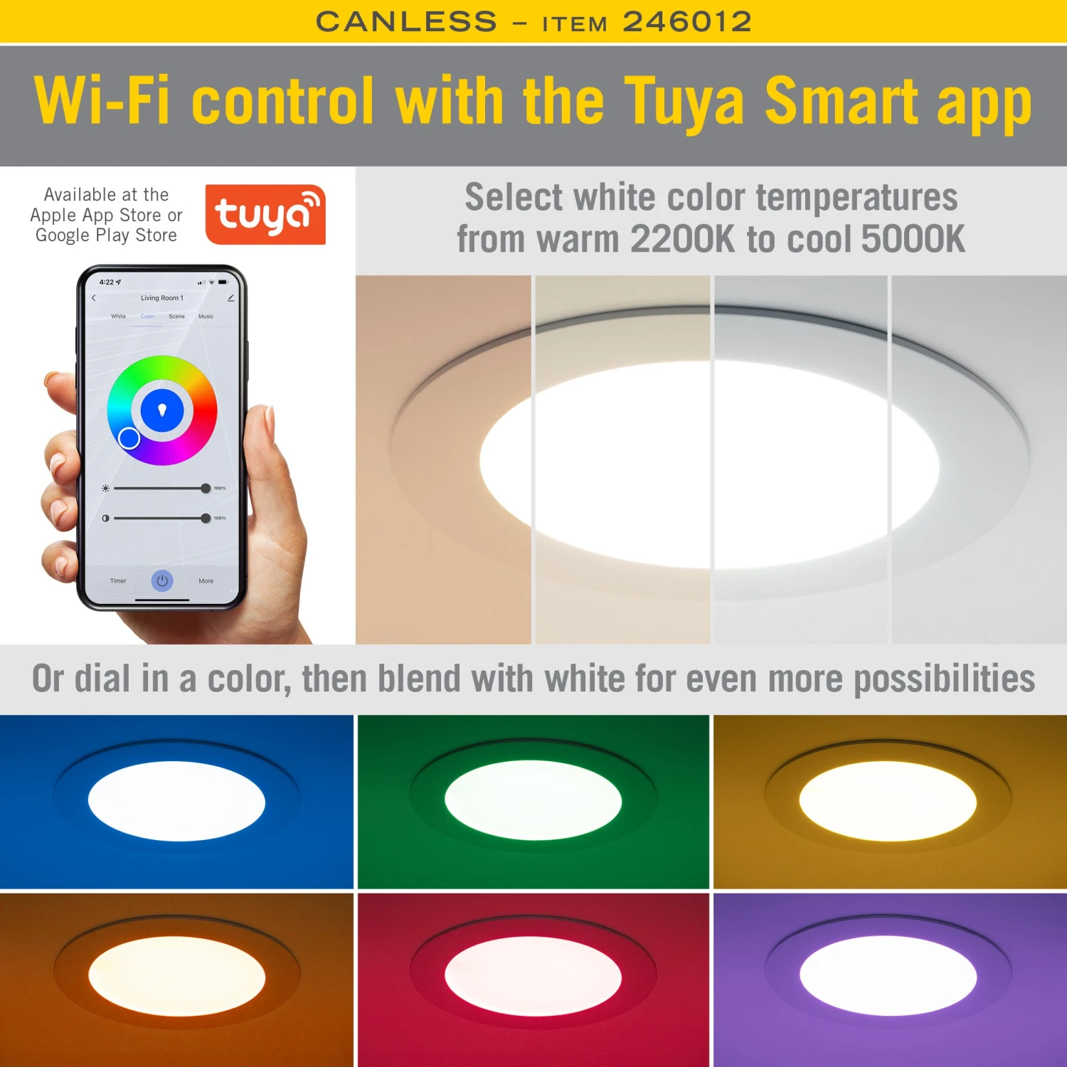 RGB+WW multicolor plus white 120V smart recessed LED ceiling lights from Armacost Lighting. Available in canless model for new 6″ LED downlight installation or retrofit trim model for existing 6″ cans. The smart multicolor LEDs can be controlled by a regular wall switch or paired with the Tuyo app for on/off, 0-100% dimming, color, and special effect control. Install the retrofit model to an existing 6 in recessed light housing (regular A24 light bulb base) or install the canless model directly into ceilings on new projects, no housing needed. Both models are slim and low profile for a clean aesthetic.Â