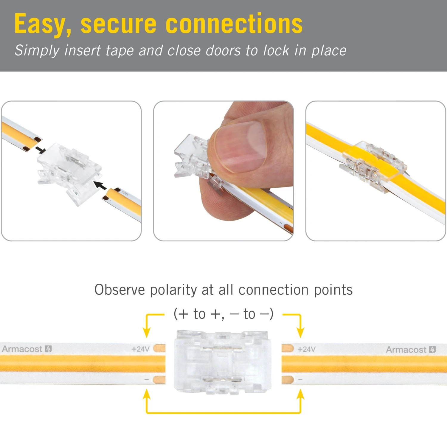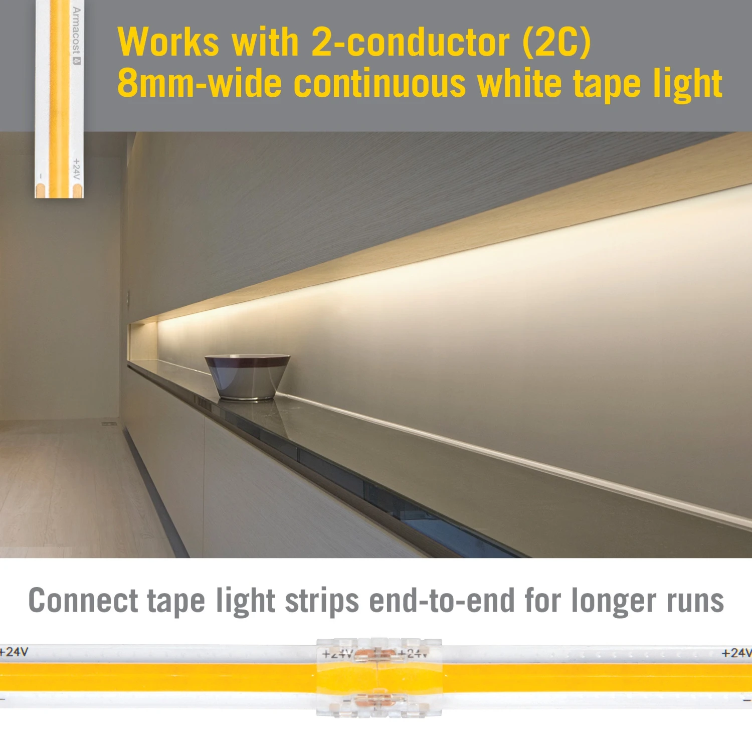 2-Pin COB Strip to Strip Connectors from Armacost Lighting are used to connect 2 sections of white or single color COB tape light into 1 continuous strip. Create tight, secure connections without soldering. Great for large or custom undercabinet and accent LED lighting installations for kitchens, bedrooms, and bathrooms.