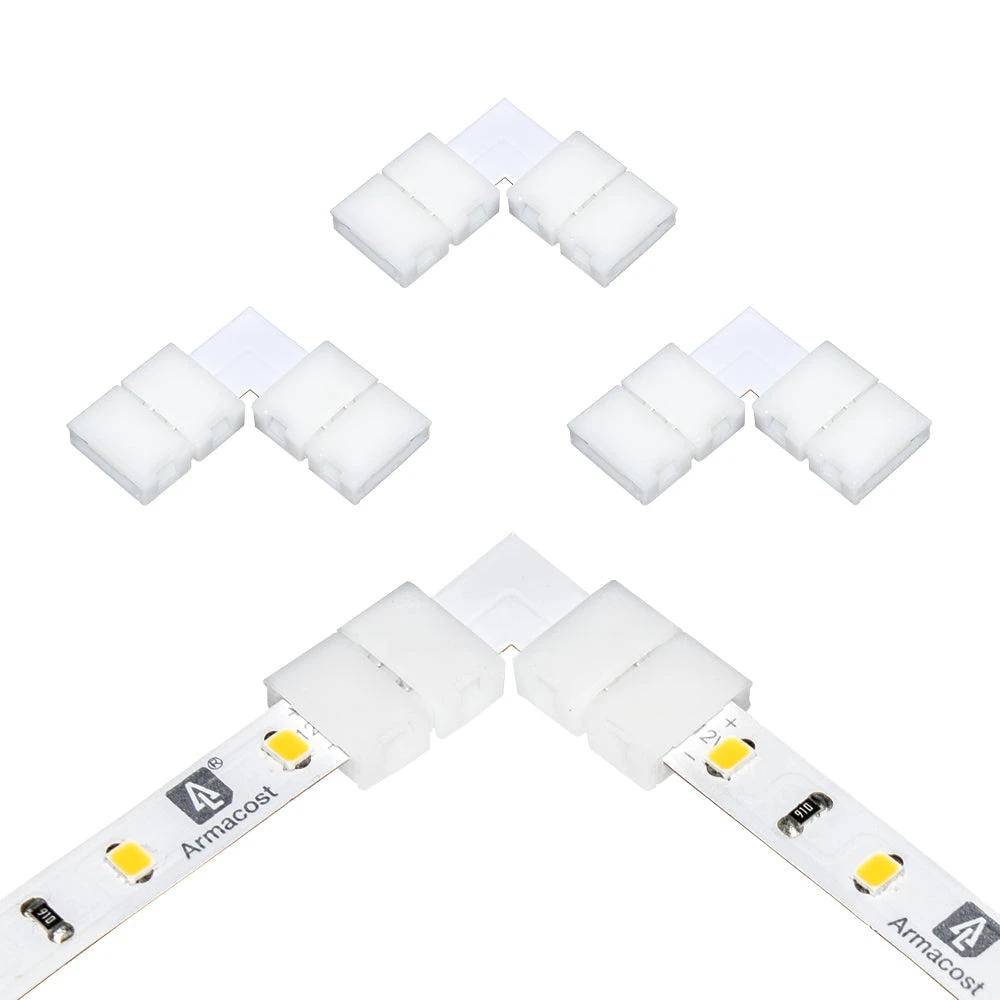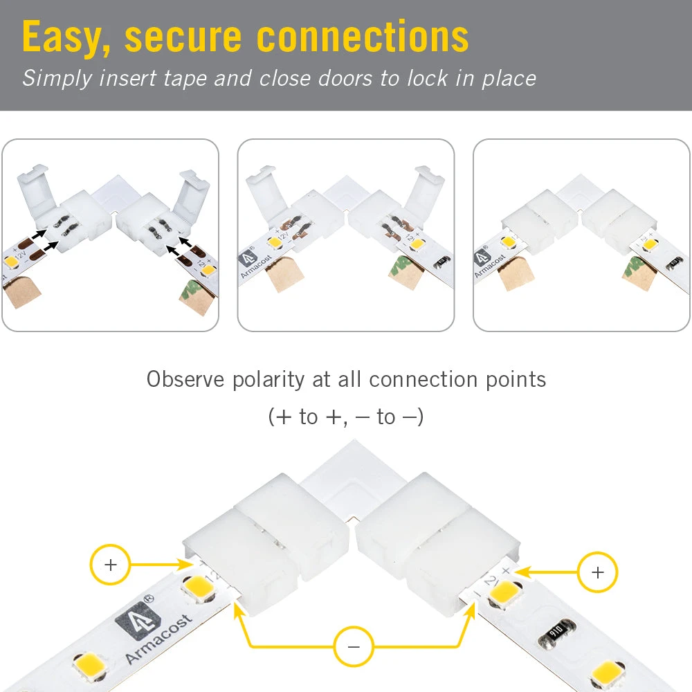2-Pin SureLock Strip to Strip LED Tape Light Corner Connectors from Armacost Lighting make angle turns in your tape lighting installation clean and neat. Compact, rigid FPE corner pieces provide a low-profile connection for extending white or single color LED strips around corners. Easy to use, no soldering is required to make a secure, reliable connection for 2C tape light. Create custom undercabinet LED lighting installations in any residential or business space.