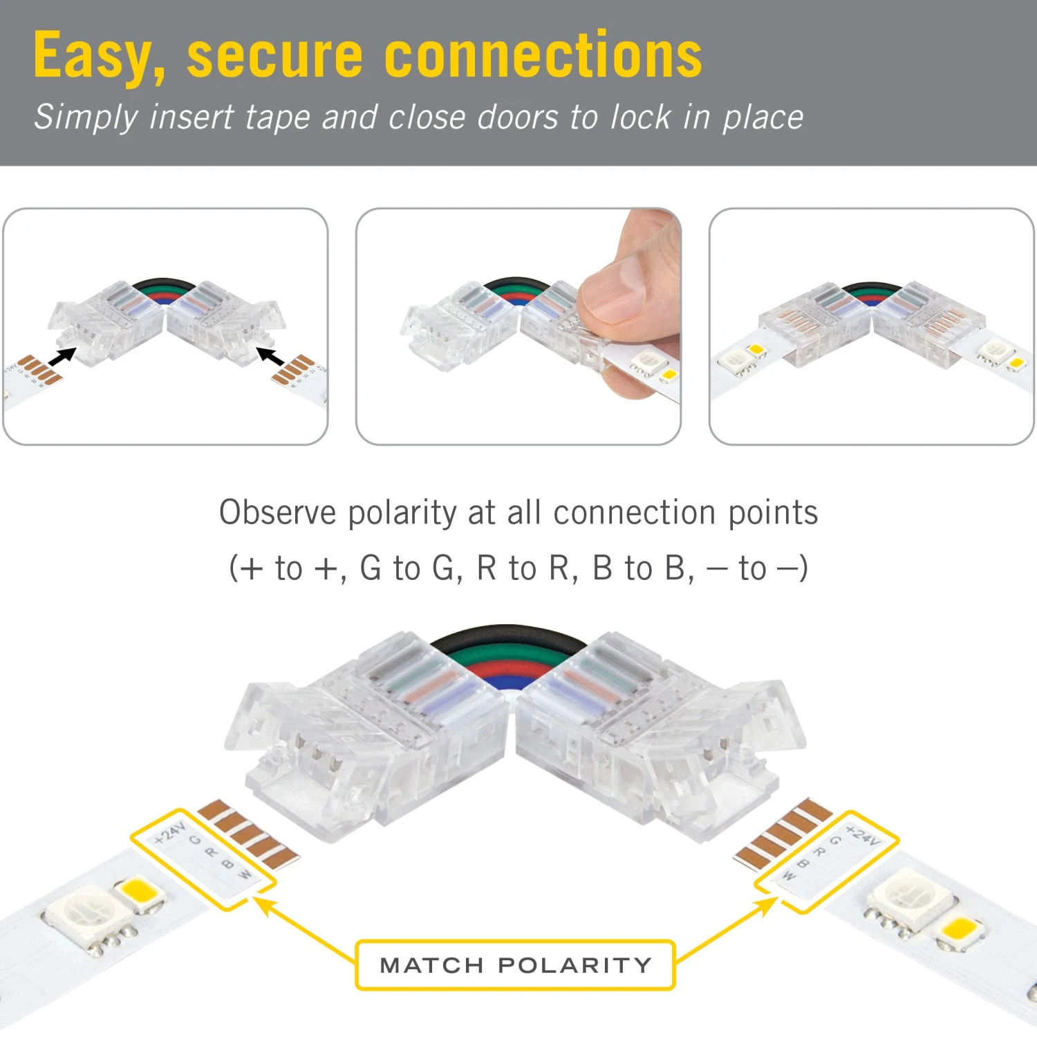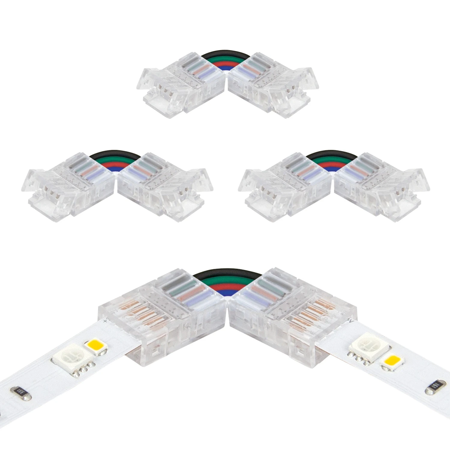 5P Tape to Tape Corner Connectors from Armacost Lighting work with 5-conductor (5C) RGB+W Tape Light. Â Use the LED strip light connectors to create secure corner connections in complex tape lighting installations.