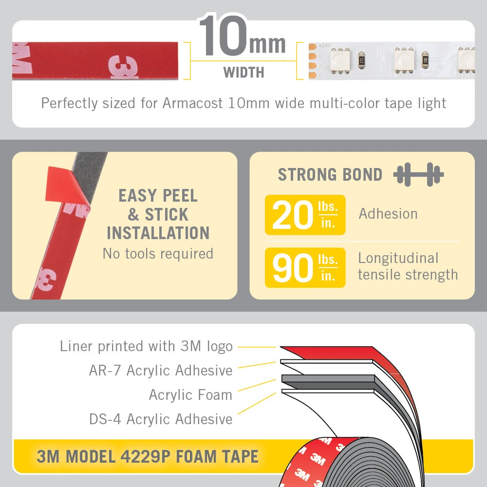 Armacost Lighting’s strong double sided 3M adhesive tape is an ideal mounting solution for LED tape lights, channels, power supplies, and controllers. The long-lasting, weather resistant bond sticks to most surfaces. Simply peel and stick to install; no tools required.