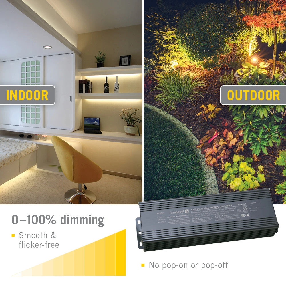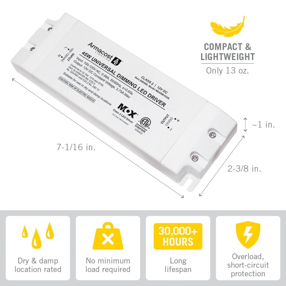 Armacost Lighting’s 12 Volt Universal Dimming LED Power Supply provides steady low voltage power to LED lighting installations. The energy-efficient LED driver is designed using professional, high-performance components that provide stable 0 or 100% dimming free of any “pop-on” or “drop-off”. For the best results use Armacost Lighting LED lights, switches and dimming light controls. Suitable for both dry and damp locations.