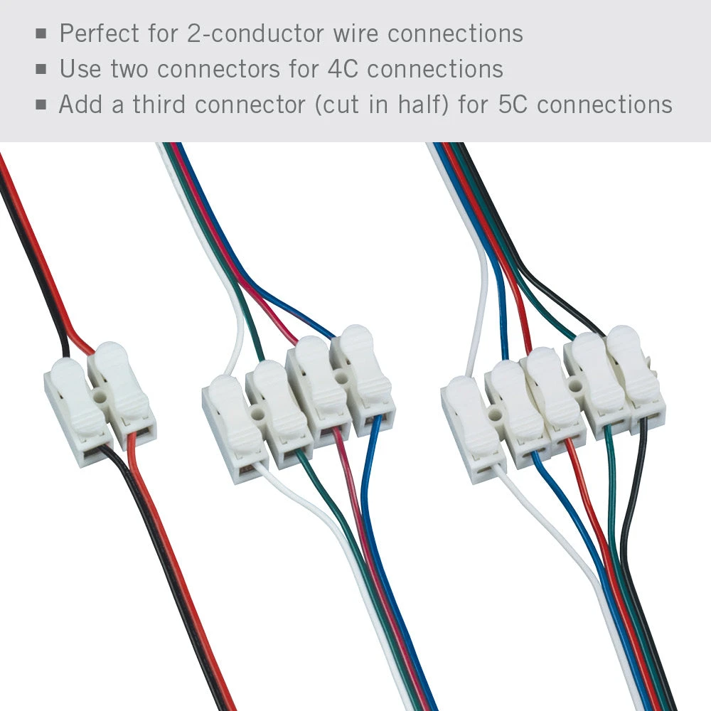 The Armacost Lighting Wire to Wire Spring Connectors are the perfect solution for connecting runs of wire. The connectors feature an easy-to-use “snap” design that locks wire in place. The wire connectors work great with 2-conductor and can be configured for 4C and 5C connections. The Snap Connectors are great for creating personalized LED lighting installations in homes, businesses, boats, RVs, and boats.