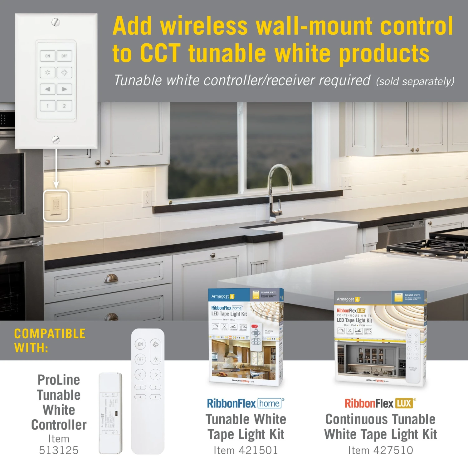 Designed for use with Armacost Lighting CCT Tunable White LED Lights, this wall switch fits in standard wall switch boxes and provides on/off, dimming, and color control. The Wireless Light Switch transmits an RF signal to the ProLine Tunable White LED Controller (required, sold separately) and works through walls and doors within 100 feet. Pair with SMD Tunable or COB Tunable LED Tape Light Kits with no extra controller/receiver needed. Installation is easy and doesn’t require any in-wall wiring; surface mount the switch on the wall using the included adhesive or install in a single or multi-gang wall box. Tunable white LED lighting, adjustable between warm 2700K and daylight 5000K, provides a versatile solution under cabinet, bedroom, bathroom, and living room installations.